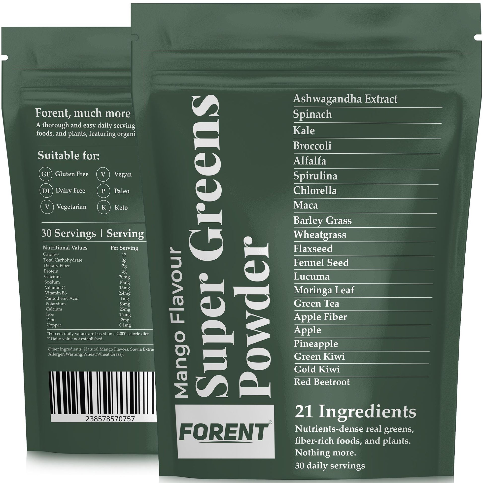 Mango Super Greens Powder with KSM-66 Ashwagandha, Spirulina, Kale and More - Organic, Vegan & Gluten-Free